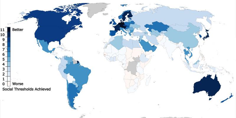 At the same time, the study scored countries on 11 social objectives established in previous research on what it would mean for countries to develop in safe and just way. The objectives included healthy life expectancy, access to energy, and democratic quality among others.