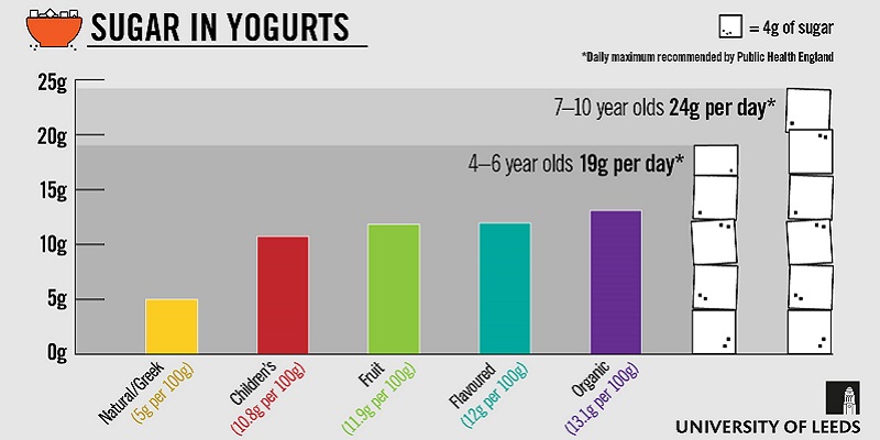 Their study, published today in BMJ Open, found that across all categories of yogurt products with the exception of natural, Greek and Greek-style yogurts the average sugar levels were well above the five grams of sugar per 100 grams threshold required to be classed low sugar and carry a green traffic light nutritional label in the UK.